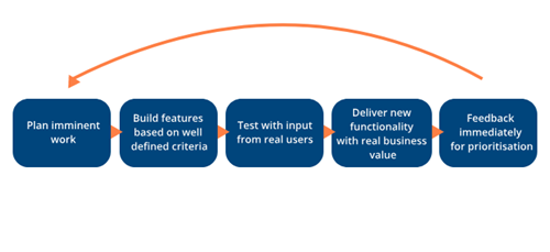 This constant feedback loop gives developers and clients the chance to add, amend or remove features regularly throughout the project lifecycle, in line with current business needs. If all the necessary work hasn’t been completed in a specific sprint or phase, any deliverables can be reprioritised and reorganised to recreate a defined plan. Typically this would mean that the process loop outlined below is completed every iteration (e.g. every two weeks) and then repeated until the project is delivered.