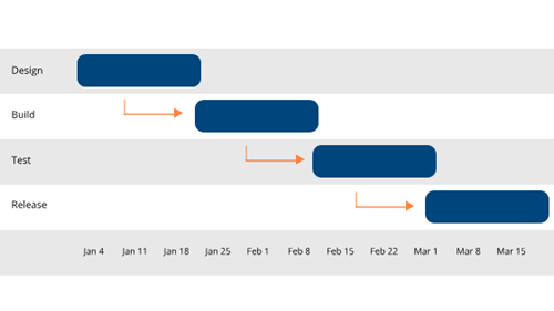 The classic way of representing a Waterfall project would be a Gantt chart, where the left-right scale represents time and tasks are listed within grouped sections on the left. This allows us to show the chronology and duration of deliverables and milestones: