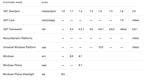 The arrows indicate that the platform supports a higher version of .NET Standard. For instance, .NET Core 1.0 supports the .NET Standard version 1.6, which is why there are arrows pointing to the right for the lower versions 1.0 – 1.5.
